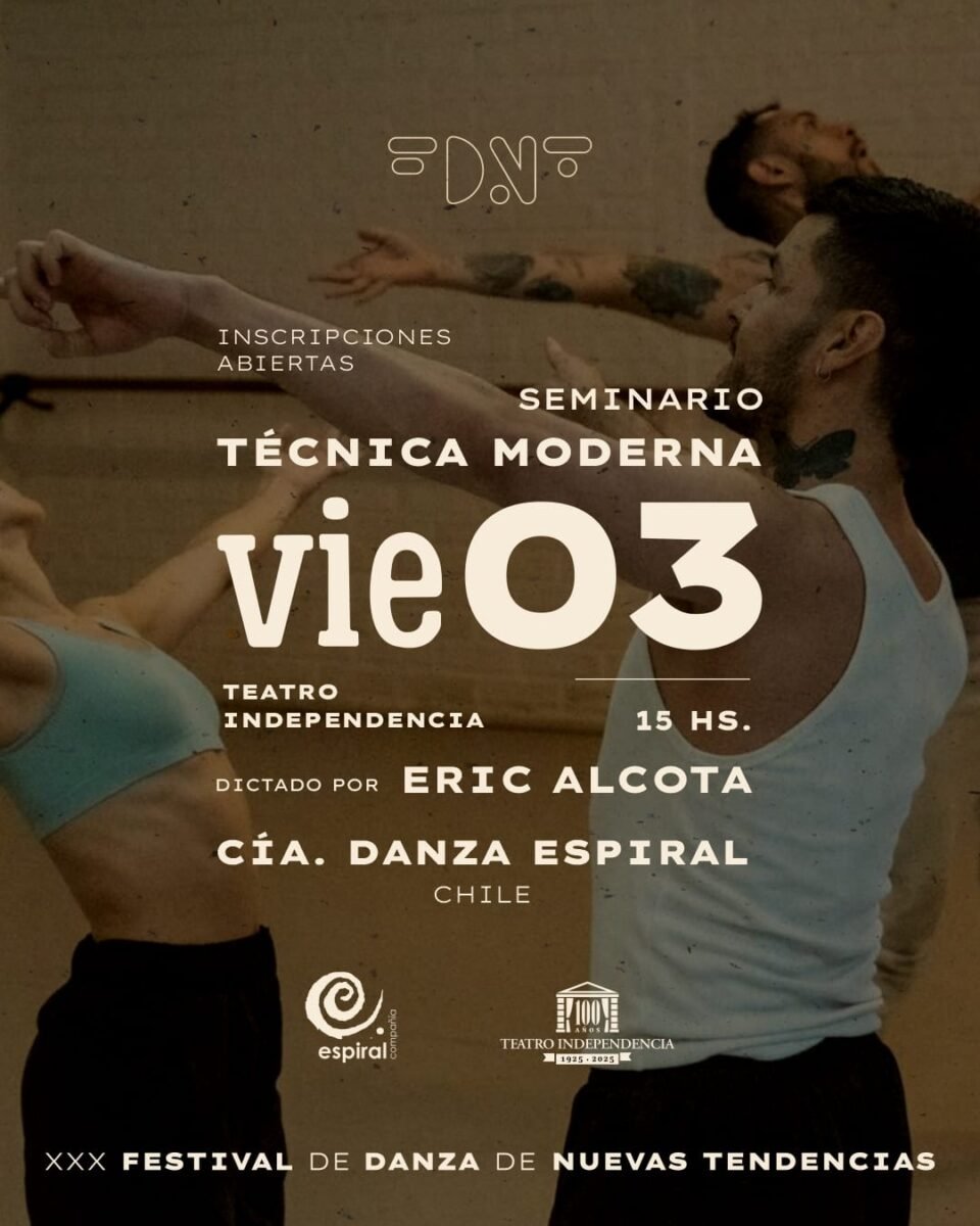 Dictado por la Cia. de Danza “Espiral” de Chile, a cargo del Profesor Eric Alcota. Licenciado en Danza mención pedagogía e interpretación UAHC – Centro de Danza. Dirigido a bailarines con experiencia o artistas corporales con entrenamiento en danza. Técnica Moderna. Nivel intermedio avanzado.