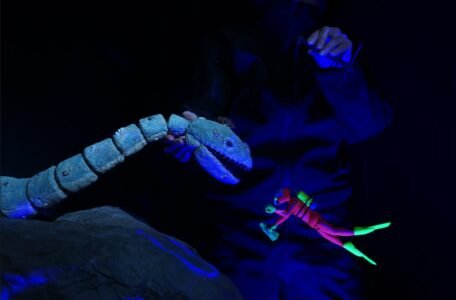 “Plesiosauria Despierta” es una obra de Teatro de Cámara negra, que utiliza el espacio escénico para representar tanto paisajes marinos de superficie, como de las profundidades. Varios de sus muñecos y utilerías están equipados con luces propias, que les permiten destacar en la oscuridad. Se utilizan además efectos lumínicos de luz agua, sumergiendo a todos los presentes.