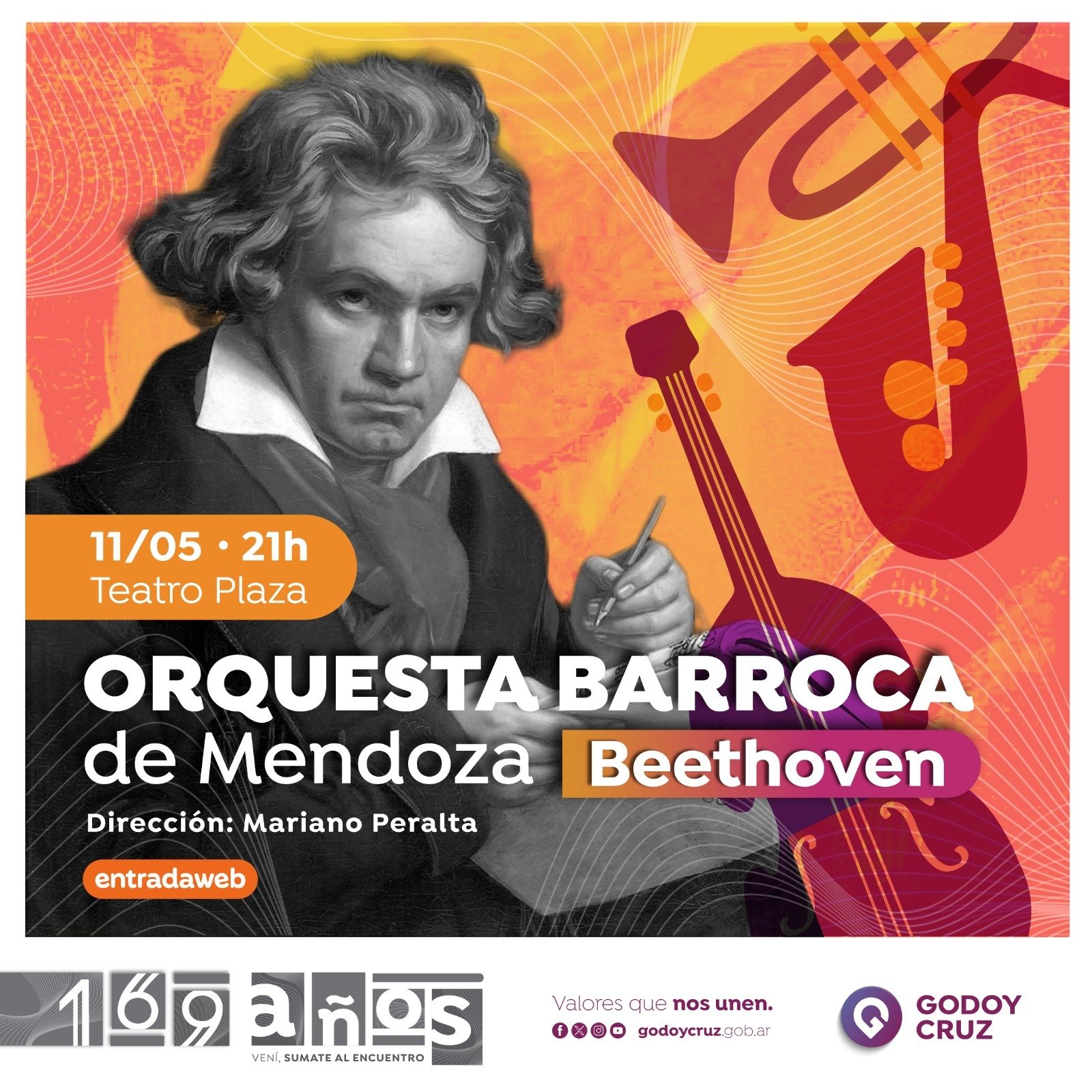 Con el motivo del 169° aniversario del departamento, el Teatro Plaza de Godoy Cruz se vestirá de gala para recibir el concierto «Solo Beethoven» a cargo de la Orquesta Barroca provincial, bajo la dirección de Mariano Peralta.