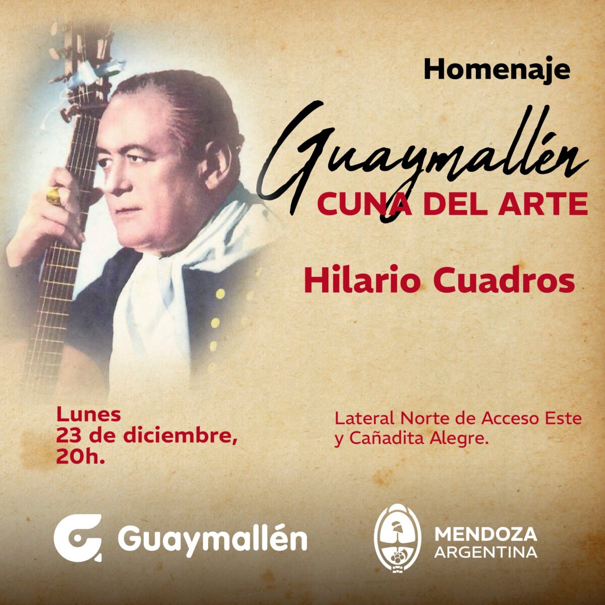 La Municipalidad invita a participar de un nuevo homenaje del ciclo “Guaymallén, cuna del arte”, al cumplirse 122 años del natalicio de Hilario Cuadros. El lunes 23 de diciembre, a las 20h, se realizará el descubrimiento de una placa recordatoria en el espacio abierto que lleva su nombre, ubicado en la Lateral Norte de Acceso Este y Cañadita Alegre. Con un destacado repertorio de canciones, se sumará al encuentro la embajadora de la Música de Cuyo, Fabiana Cacace.