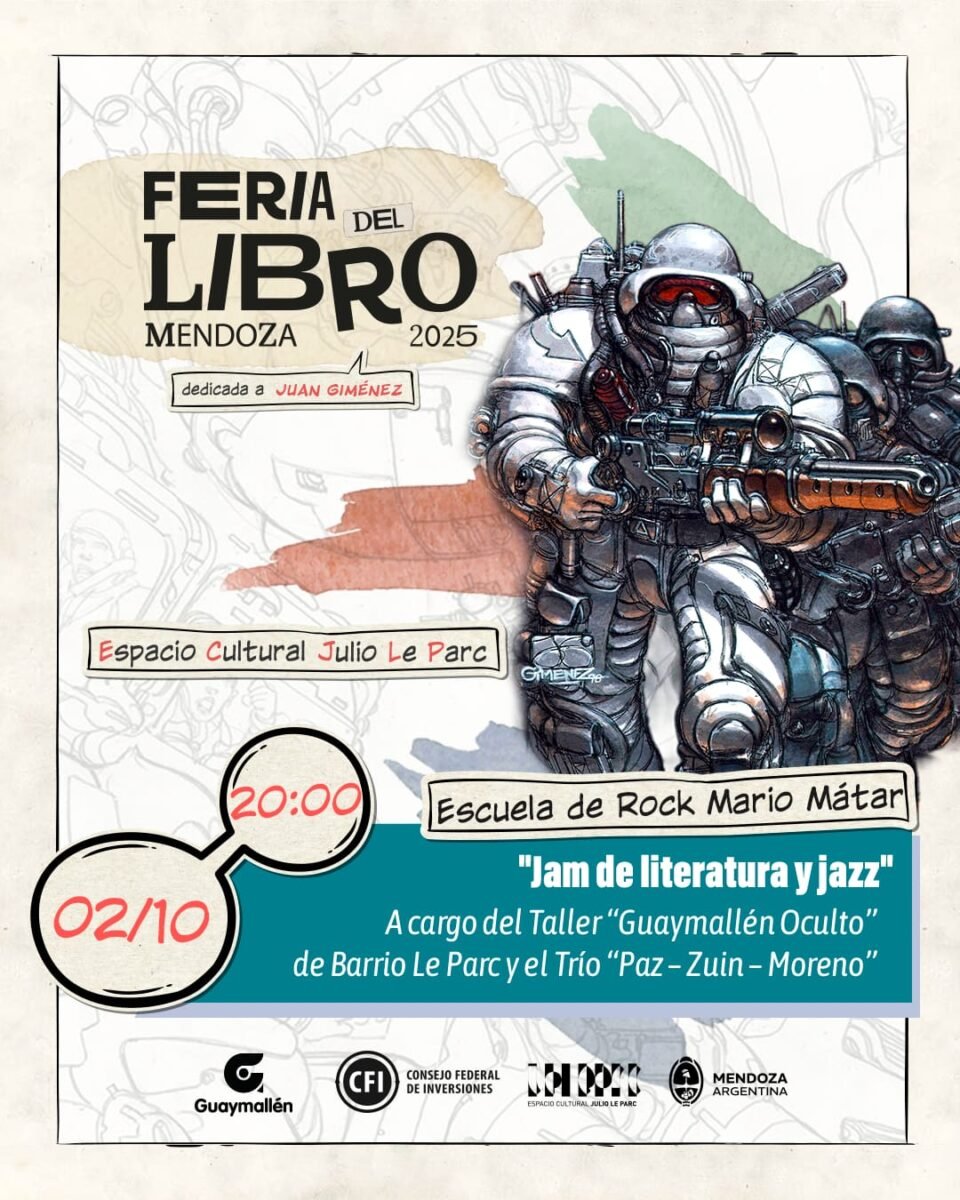 El jueves 2 de octubre, a las 20h, la feria vivirá una experiencia performática única en la Escuela de Rock Mario Mátar (espacio exterior del Le Parc). Allí, el taller “Guaymallén oculto”, coordinado por los profesores Frank Morán y Nicolás Garro, unirá improvisaciones de escritura en vivo con jazz de la mano del trío Paz-Zuin-Moreno y artistas invitados. La propuesta culminará con un poema colectivo creado entre participantes y público. Entrada gratuita, cupos limitados.