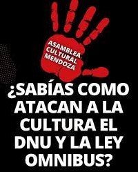 Tambien aclaran que «destruye la base de sustentabilidad y proyección de la actividad artística nacional al proponer derogar o debilitar las herramientas construidas en la democracia». Entre los aspectos más lesivos para el sector, se encuentra la propuesta de derogar las leyes que dan origen al Instituto Nacional del Teatro, al Fondo Nacional de las Artes, al Instituto Nacional de la Música y la Ley del Precio Único de Libro. También provoca cambios importantes en el financiamiento y funcionamiento del INCAA (Instituto Nacional del Cine) y la CONABIP (Organismo que nuclea a las Bibliotecas populares del todo el Pais).