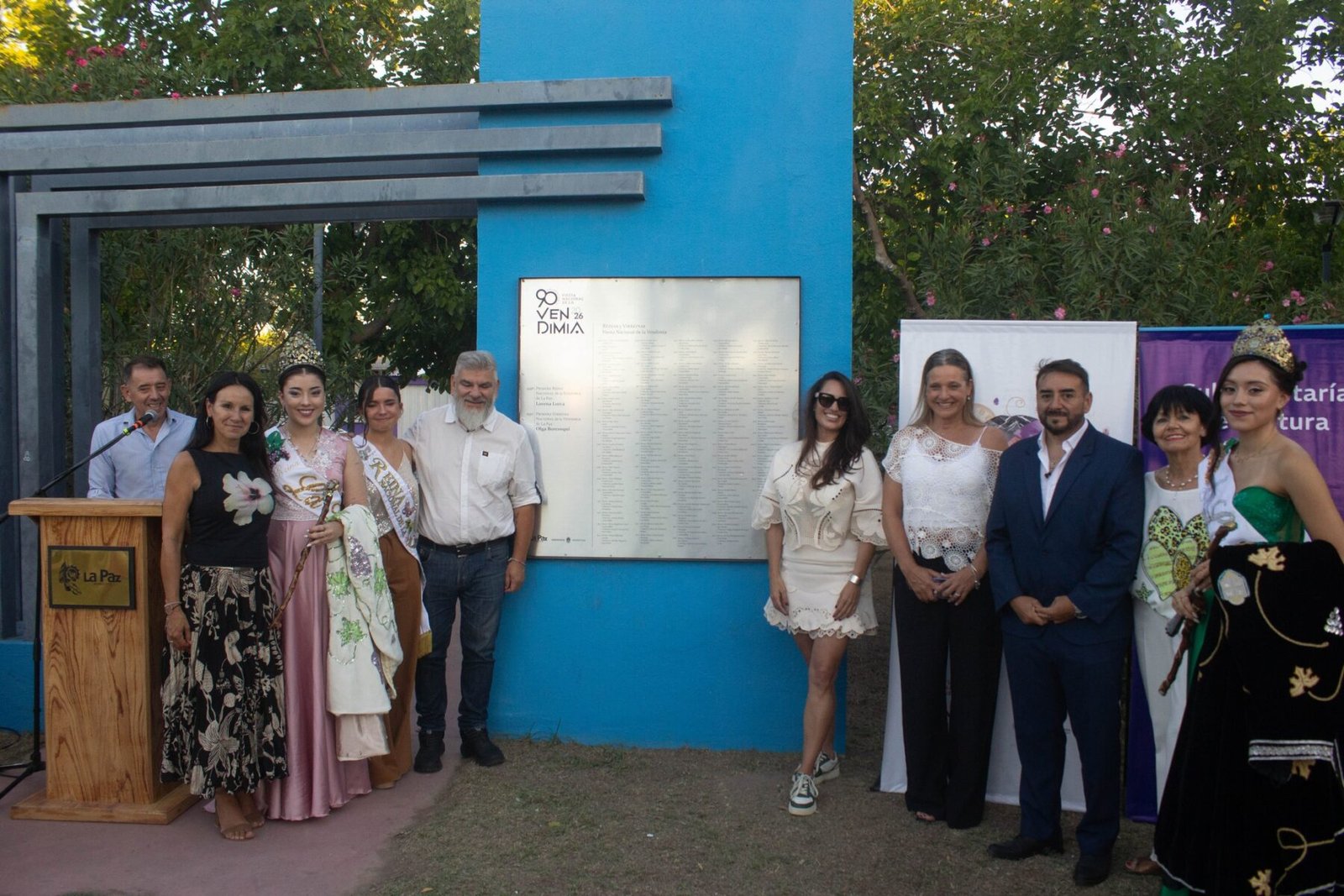 El Intendente Fernando Ubieta, junto al Subsecretario de Cultura de Mendoza, Diego Gareca, descubrieron una placa en la Plaza Alas Argentinas en homenaje a los 30 años del reinado de Lorena Lorca, la primera Reina Nacional de la Vendimia paceña, coronada en 1996.