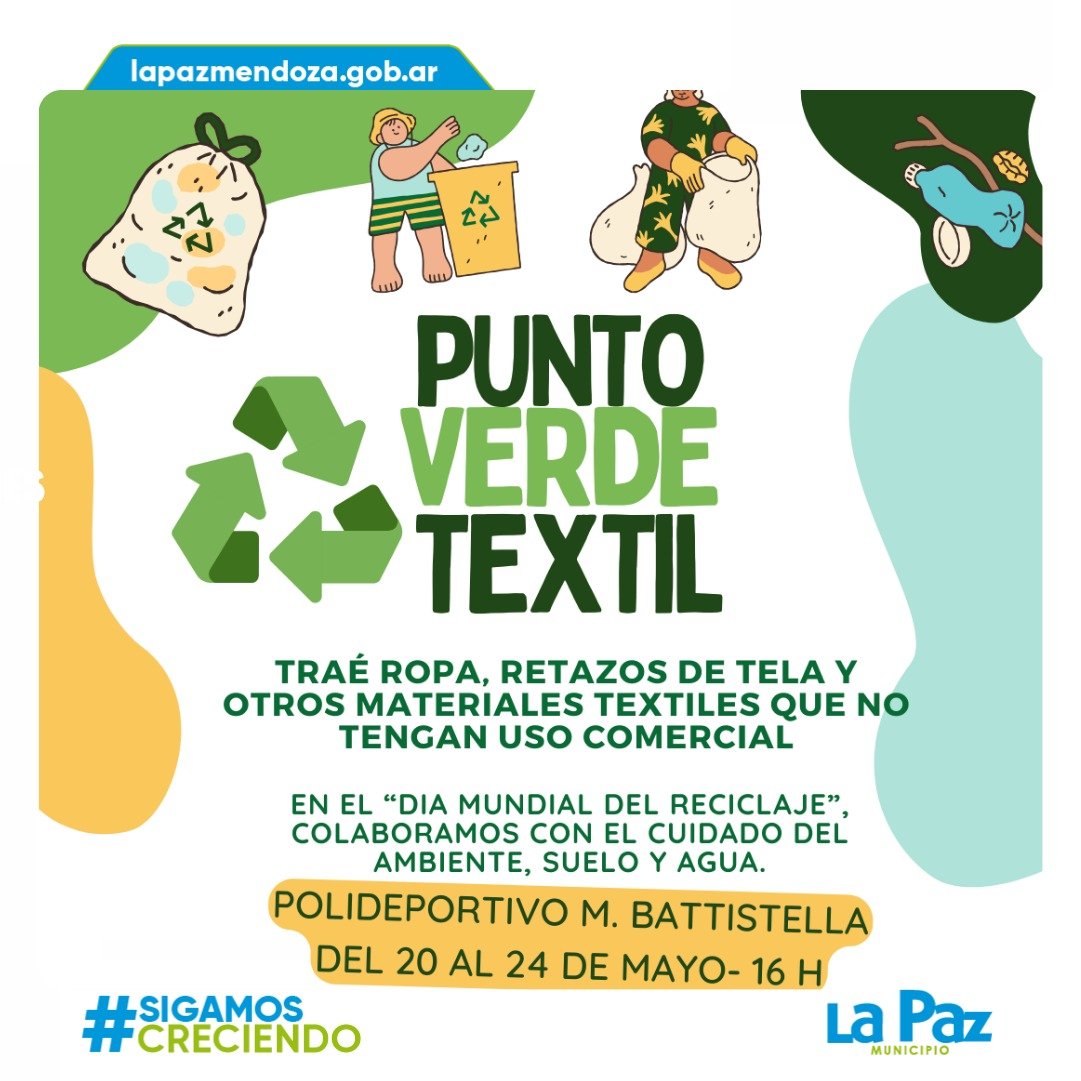En el marco del Día Mundial del Reciclaje, te invitamos a participar de la iniciativa «Punto Verde Textil»: Traé tu ropa, retazos de tela y otros materiales textiles que no tengan uso comercial al punto verde que estará en el Polideportivo «Prof. Miguel Battistella» hasta 24 de mayo, a las 16. La iniciativa comenzó el pasado 20 de mayo.