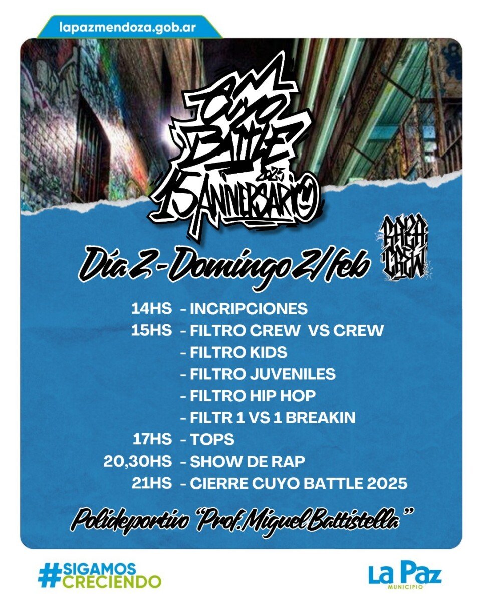El Portal de Mendoza se prepara para recibir a los mejores bailarines de Argentina y Chile en la Cuyo Battle 2025, un evento que celebra 15 años ininterrumpidos de historia, siendo reconocido como uno de los encuentros más relevantes de la disciplina en Argentina. Con competidores provenientes de Buenos Aires, Santa Fe, el norte del país, San Luis, Chile y diversos puntos de Mendoza, la edición de este año promete ser una verdadera fiesta de la cultura urbana.