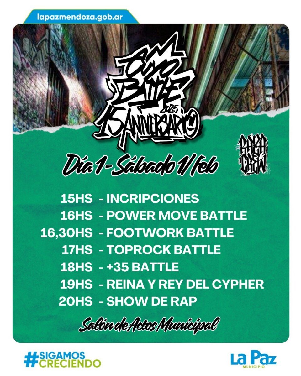 La Cuyo Battle 2025 se desarrollará en tres días cargados de shows y entrenamiento, destacando la participación masiva de artistas y el espíritu del arte urbano. El 31 de enero marcará el inicio con una jornada especial de recibimiento para los competidores, que incluirá un show de rap, música en vivo, sesiones de entrenamiento libre y una degustación de vinos, combinando lo mejor del arte local con la esencia de la cultura urbana.