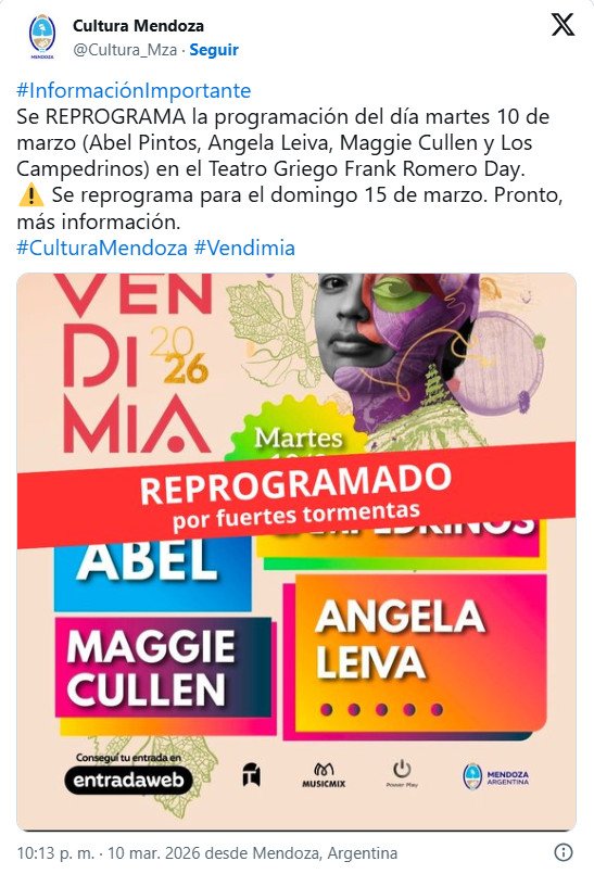 El Gobierno de Mendoza, a través de la Subsecretaría de Cultura, confirmó la reprogramación de una de las noches del calendario vendimial a raíz de las tormentas registradas en la provincia.