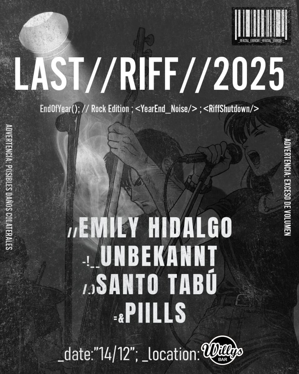 Este domingo 14 de diciembre, Willys Bar se convierte en punto de encuentro para el rock mendocino con LAST RIFF 2025, un show colectivo que reúne a Emily Hidalgo, Unbekannt, Santo Tabú y PIILLS en una noche pensada para cerrar el año a todo volumen.