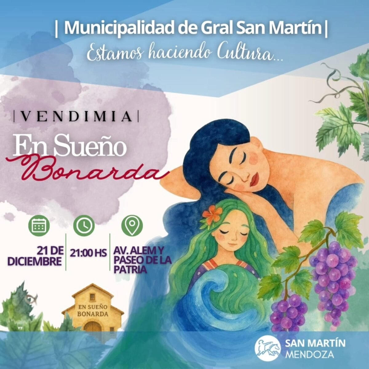Hoy domingo por la noche, desde las 21, San Martín vivirá su Fiesta Departamental de la Vendimia sobre la Avenida Alem, frente al Paseo de la Patria. El espectáculo de este año lleva por nombre “Vendimia en Sueño Bonarda” y propone un relato mágico inspirado en la historia vitivinícola del departamento.